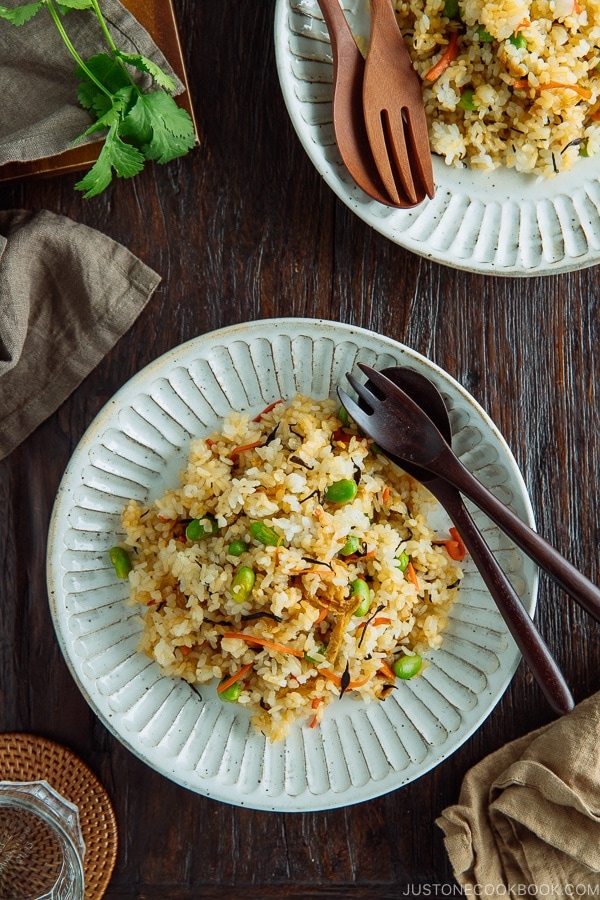 the ingredients you will need are: any kind of rice, edamame, seaweed, carrots, green onion, eggs, soy sauce, peas, and spam.