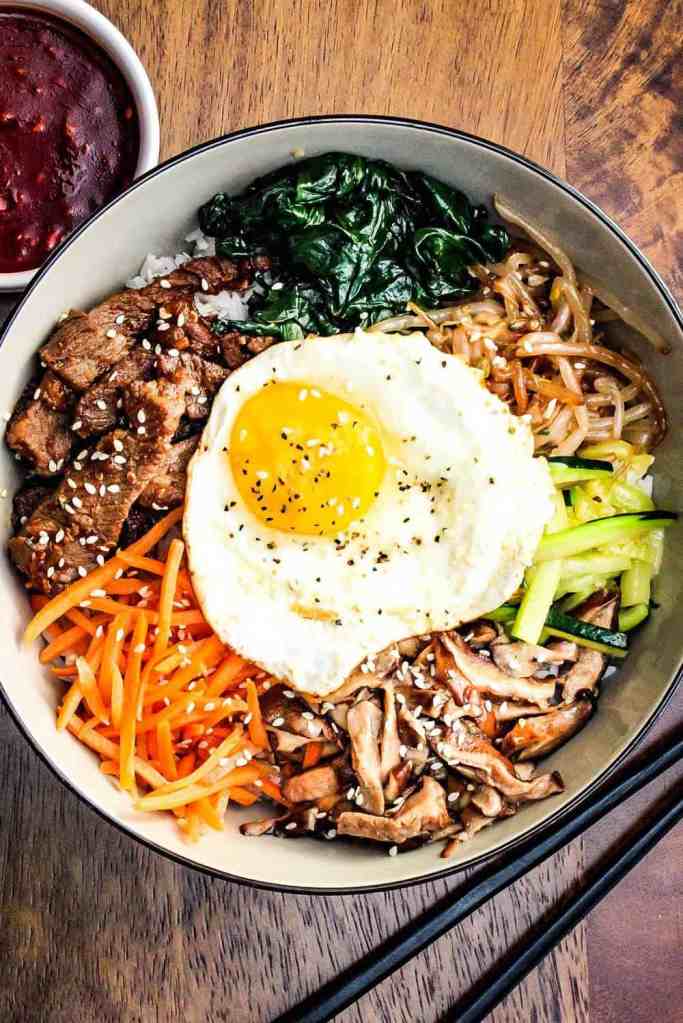 - Add a bit of rice to each bowl. I use pasta bowls because I love how wide they are and they are great for presentation. Picking out veggies one at a time, place each in circle around bowl, then add kimchi and cooked beef. Top with egg, then sprinkle bowl with sesame seeds and serve.
