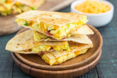 - Place second tortilla shell on top of egg mixture and lightly press down. Heat for 2-3 minutes on both sides, or until shell is slightly golden and cheese is melted. Repeat with remaining tortilla shells. Serve immediately.