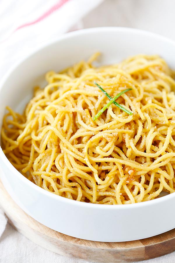 - Add noodles to a large bowl. Pour sauce over noodles. Toss until noodles are evenly coated in sauce. Garnish with parsley. Dish out noodles and top with Parmesan cheese. Noodles are best consumed warm.